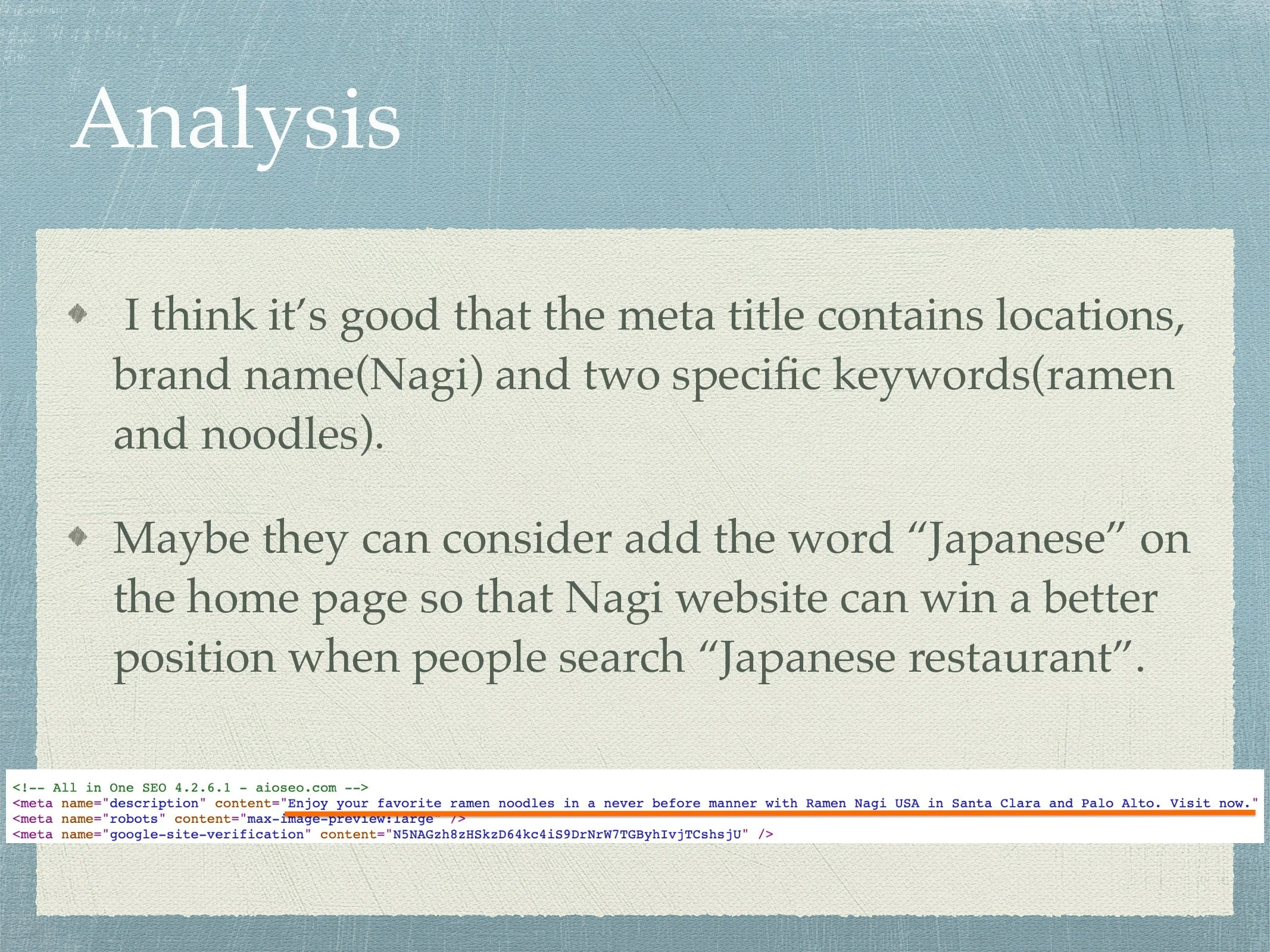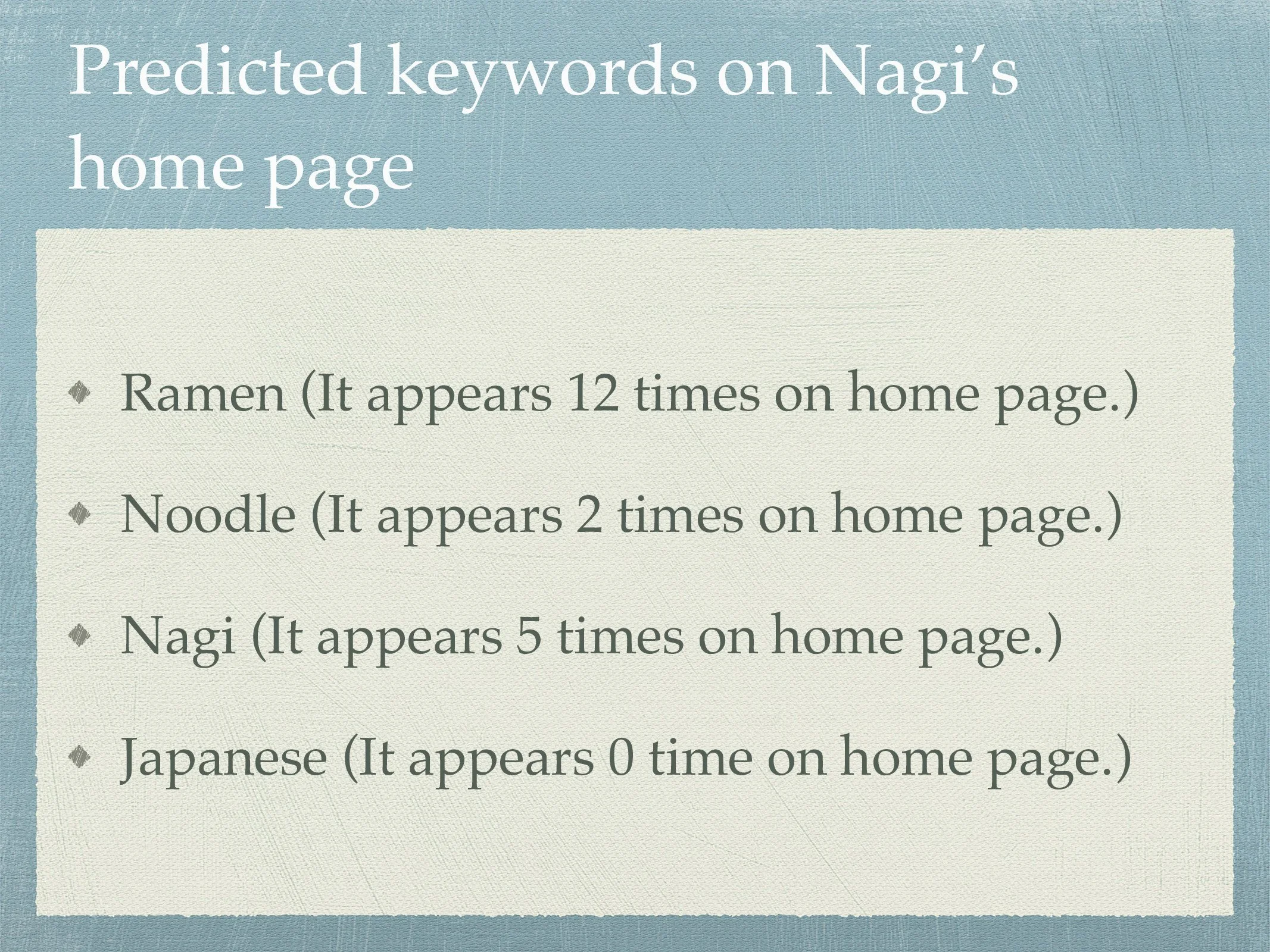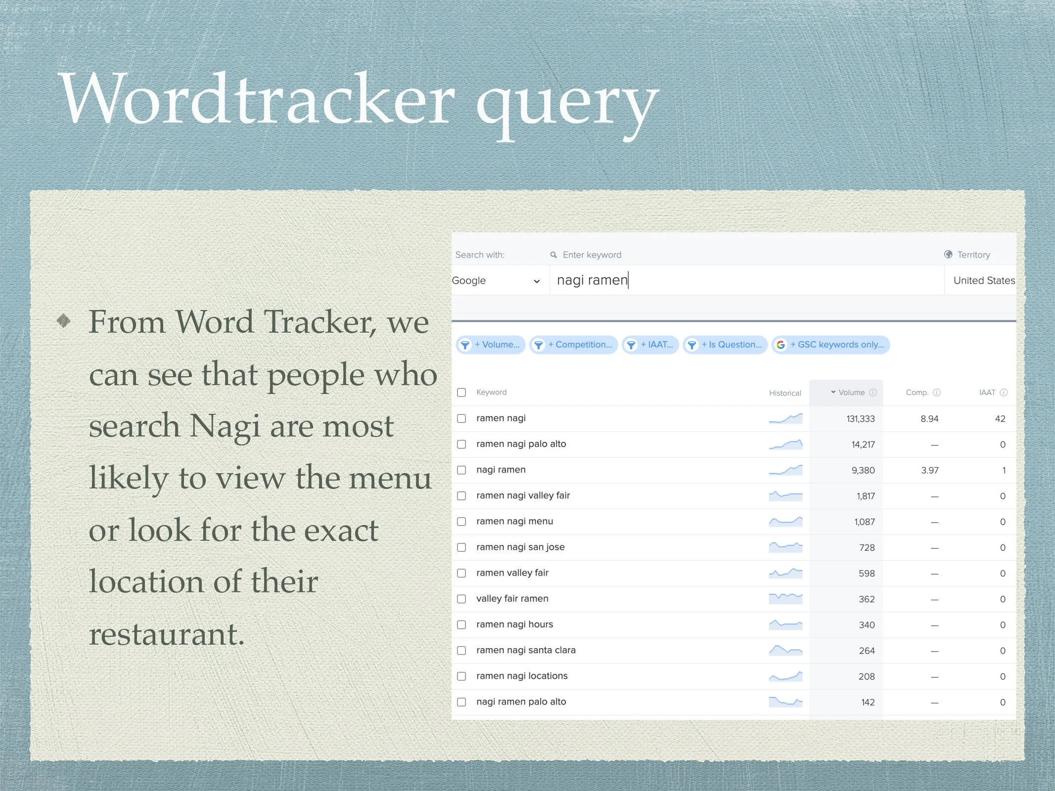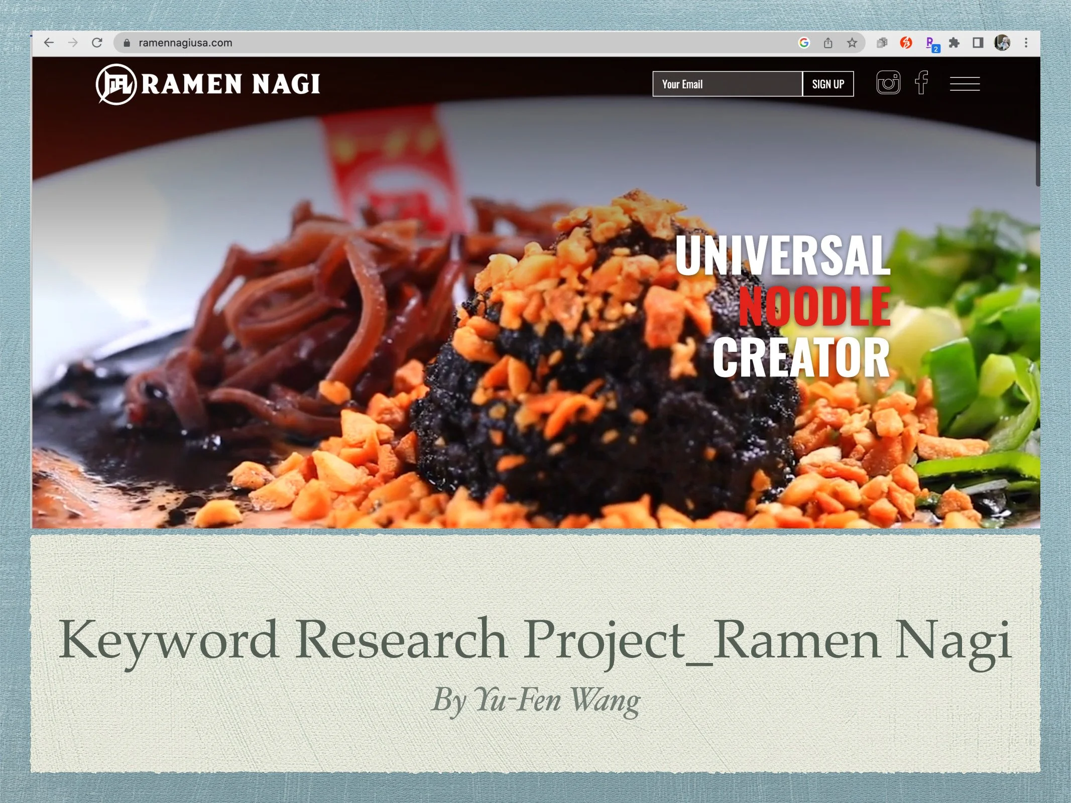 Keyword Research Project for Ramen Nagi Website Slide 1 Slide 1 (current slide) Slide 2 Slide 2 (current slide) Slide 3 Slide 3 (current slide) Slide 4 Slide 4 (current slide) Slide 5 Slide 5 (current slide) Slide 6 Slide 6 (current slide) Slide 7 Slide 7 (current slide) Slide 8 Slide 8 (current slide) Slide 9 Slide 9 (current slide)